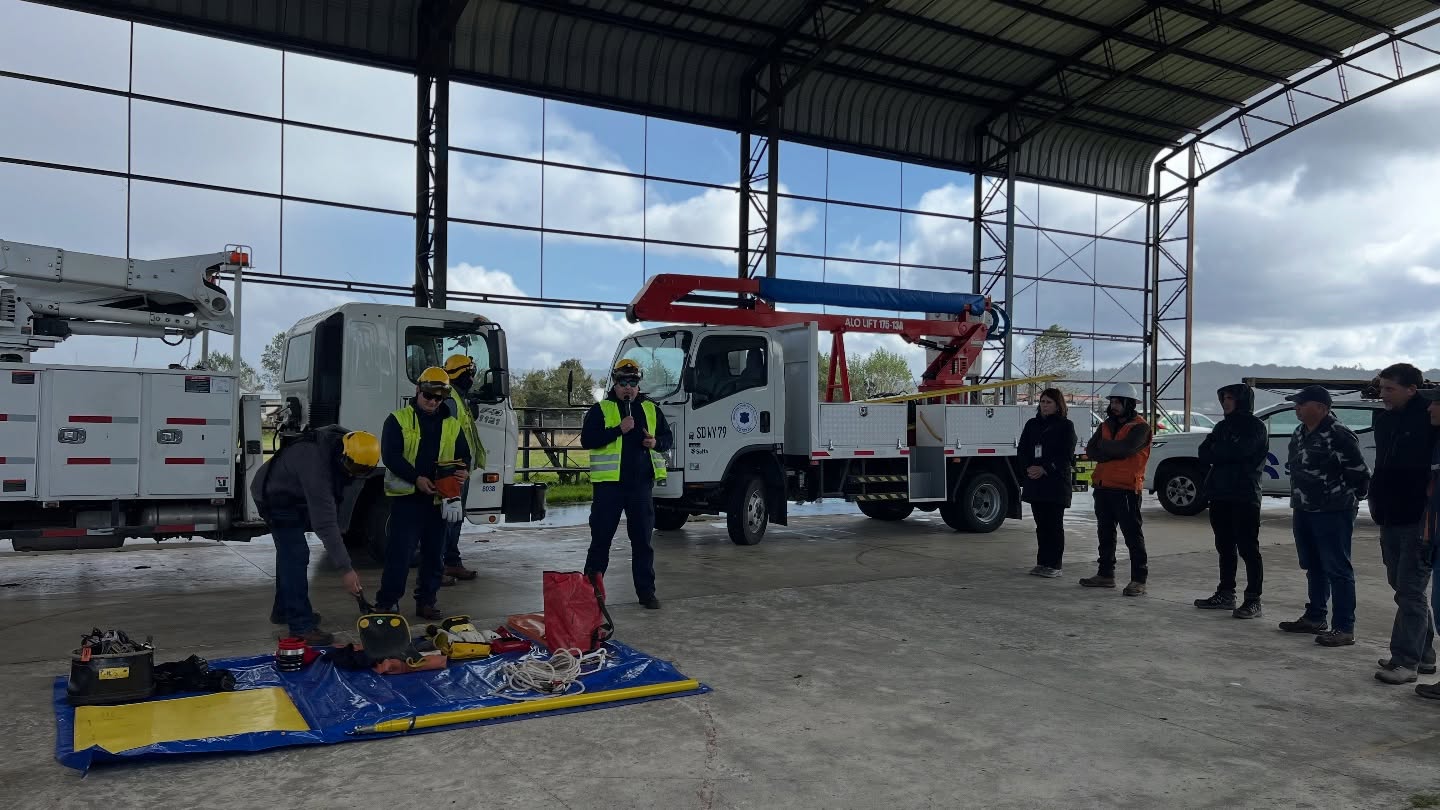 La actividad, gestionada a solicitud del área de prevención de riesgos de la Municipalidad de Quellón, incluyó una charla técnica y una demostración práctica liderada por el equipo de “líneas vivas”, grupo especializado de Saesa en Chiloé. Durante la jornada, se presentaron buenas prácticas, uso correcto de elementos de protección personal y protocolos clave para la intervención segura en redes eléctricas.